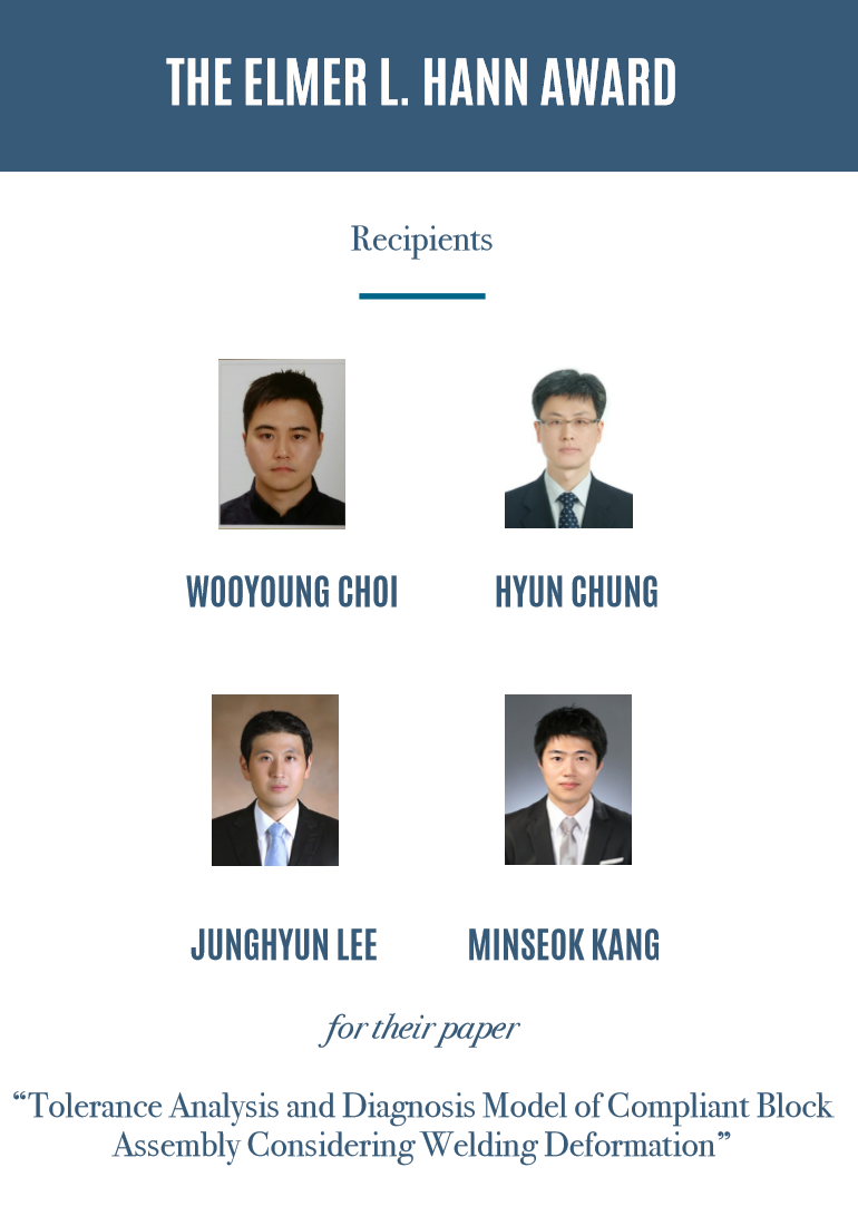 The award will be presented to the author (s) of the "best paper on ship production delivered at the Ship Production Symposium." The title of the award to be "Elmer L. Hann Award." The award consists of a certificate similar to the Spring Meeting Paper Award. Eligibility for the award need not to be limited to membership in SNAME. In case of co-authors, each receives an award. The proposal for the "Elmer L. Hann Award" shall be made by the Journal of Ship Production Committee. The name of the nominee shall be submitted to the Awards Committee no later than June 1. The Awards Committee shall consider the nominee requiring a two-thirds vote for approval. The award will be presented at the next Ship Production Symposium or such other time as the President may arrange. The award may be made annually.